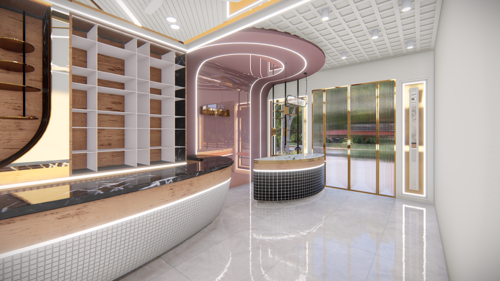 This space embodies modern luxury and warmth, where openness meets comfort. The expansive glass walls blur the boundary between indoors and outdoors, while rich wood tones, a plush recliner, and elegant shelving create an inviting yet sophisticated vibe. Natural light, sleek detailing, and thoughtful zoning make it a place to relax, reflect, and unwind with style.