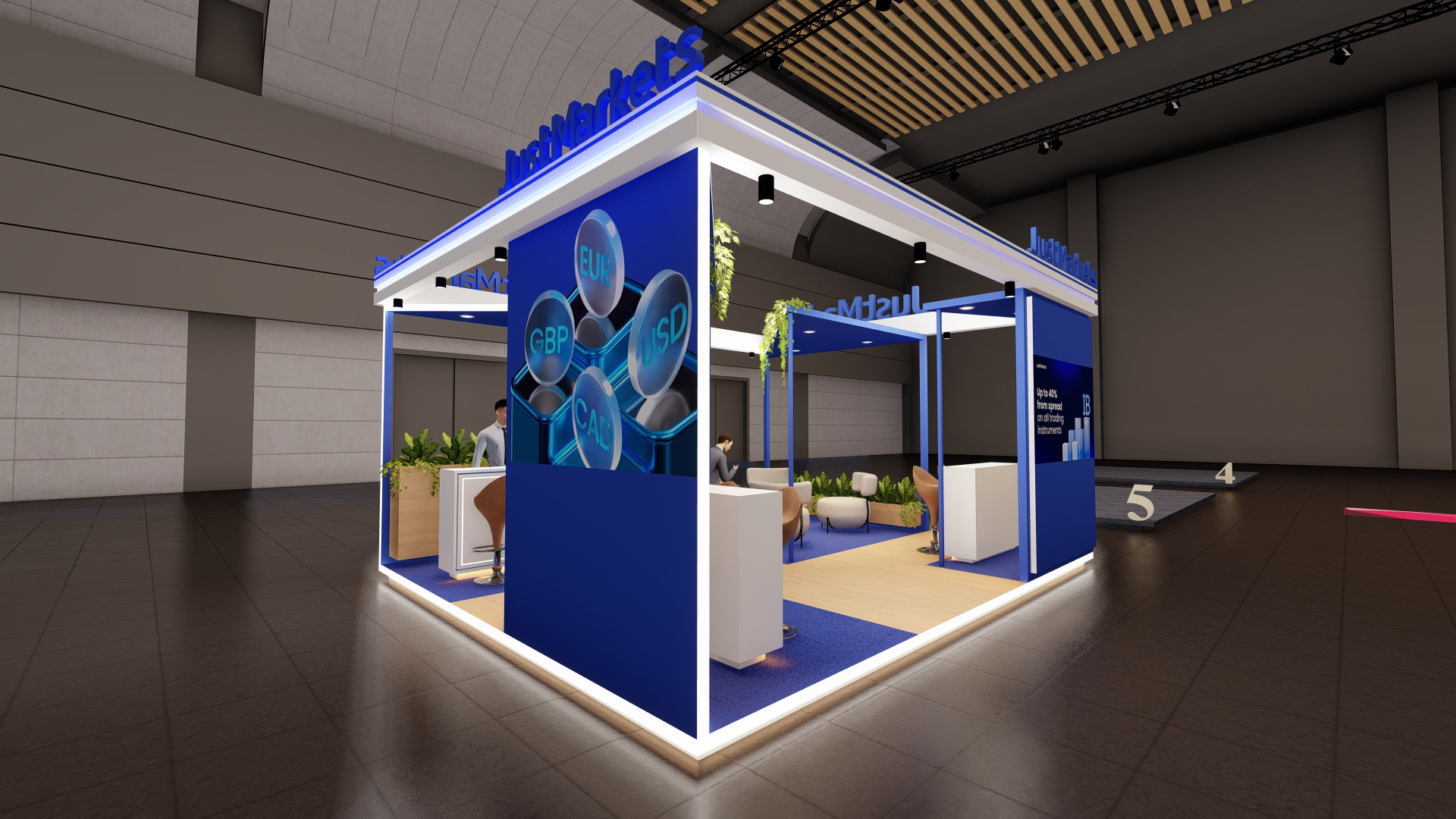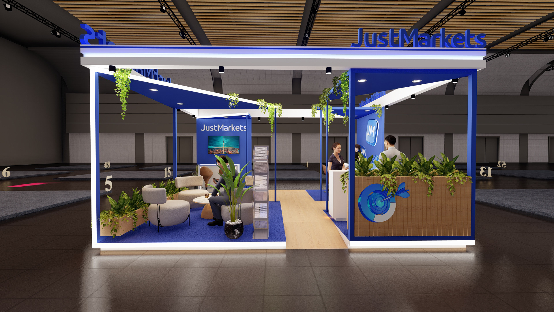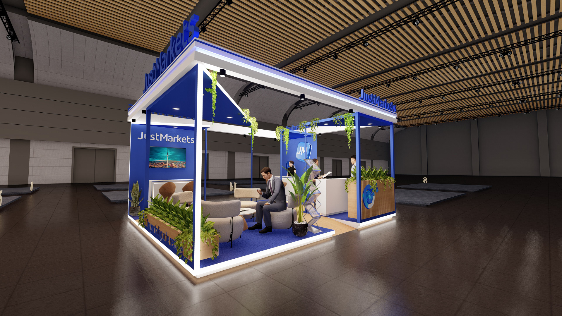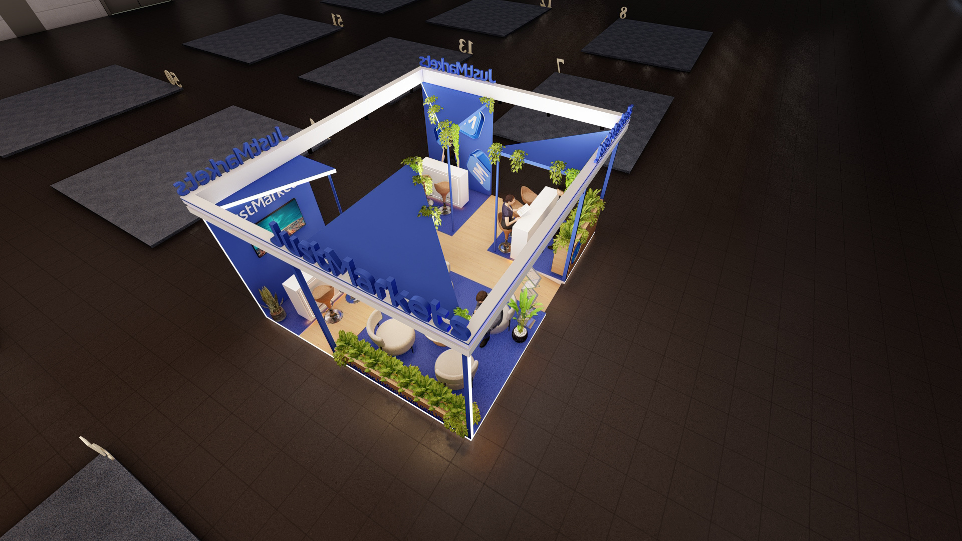 This expo booth features a modern, open-concept layout utilizing a vibrant blue and white corporate palette accented by warm wood textures and integrated biophilic elements. The design incorporates dynamic, angular canopy structures and a mix of formal reception areas and casual lounge seating to facilitate diverse professional interactions. High-impact branding and strategic overhead lighting ensure maximum visibility and a welcoming atmosphere within the exhibition hall.