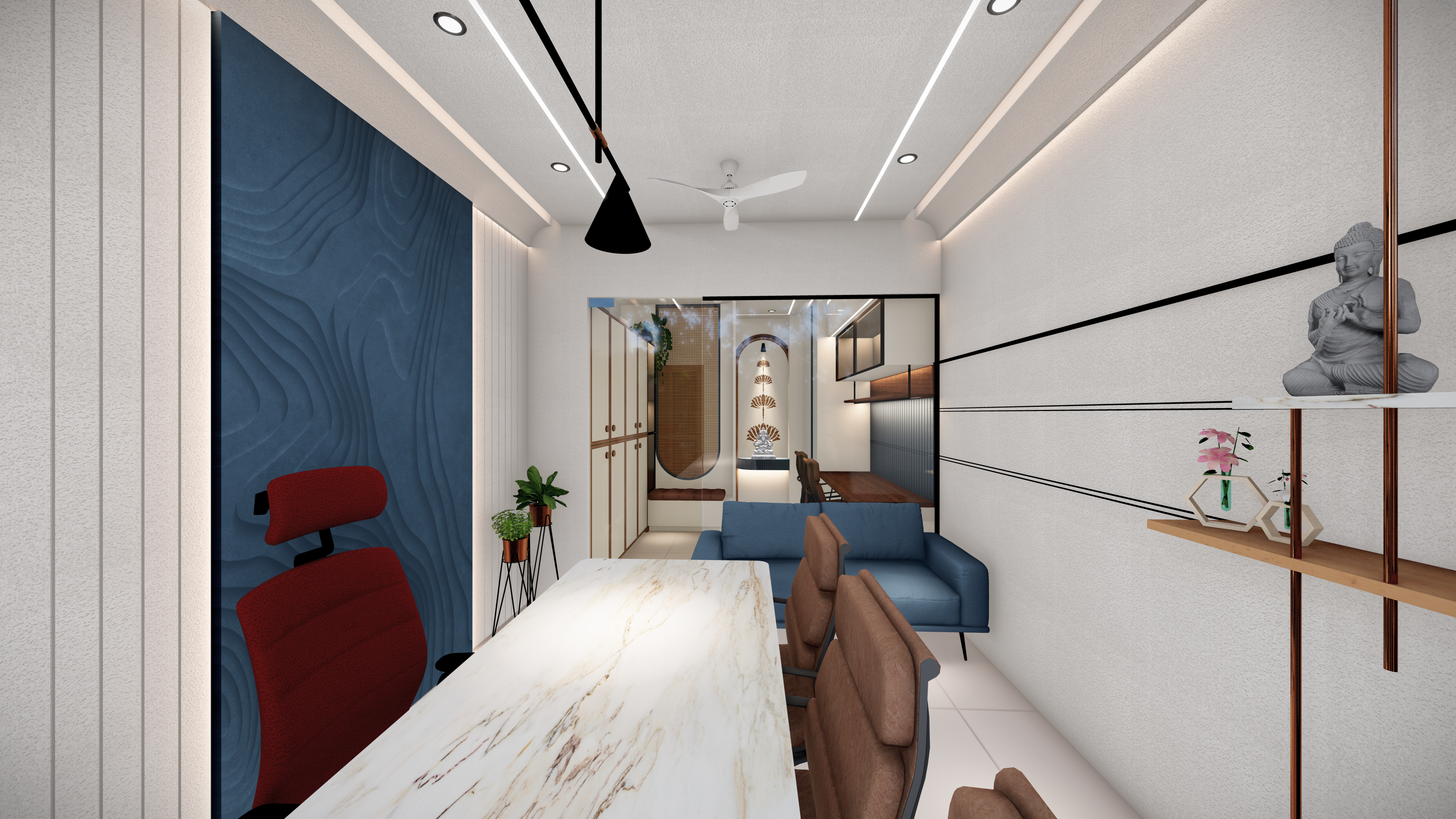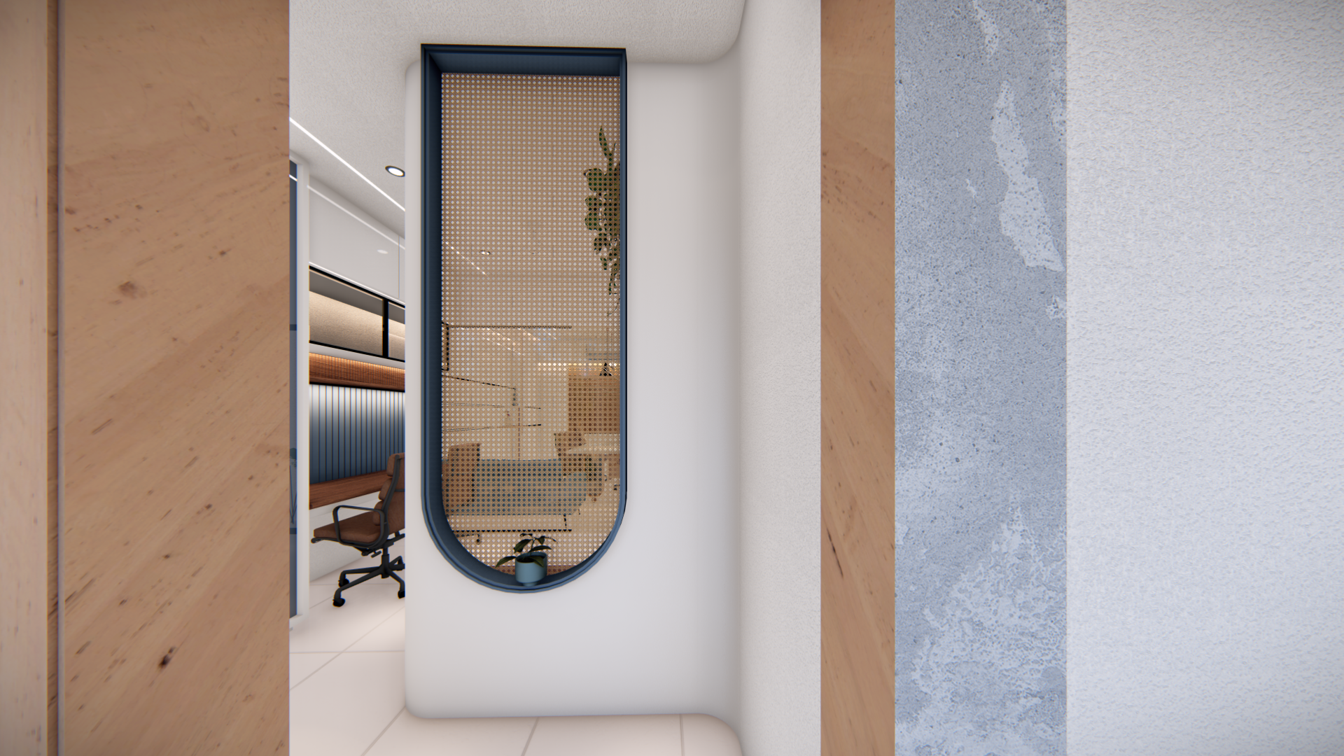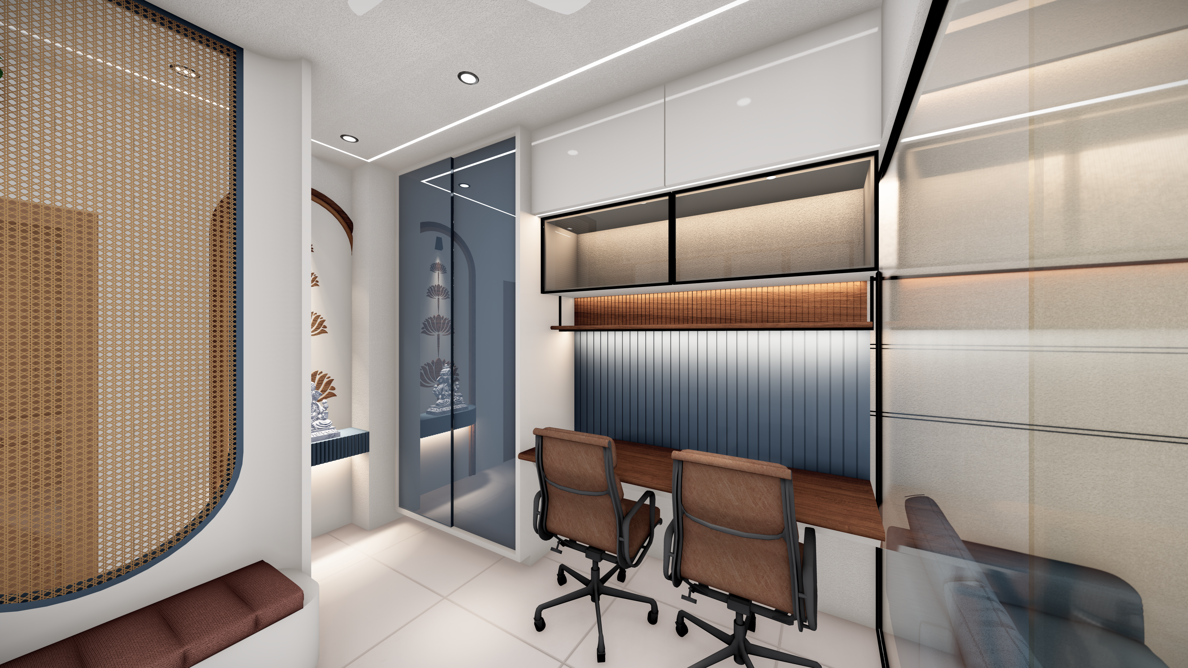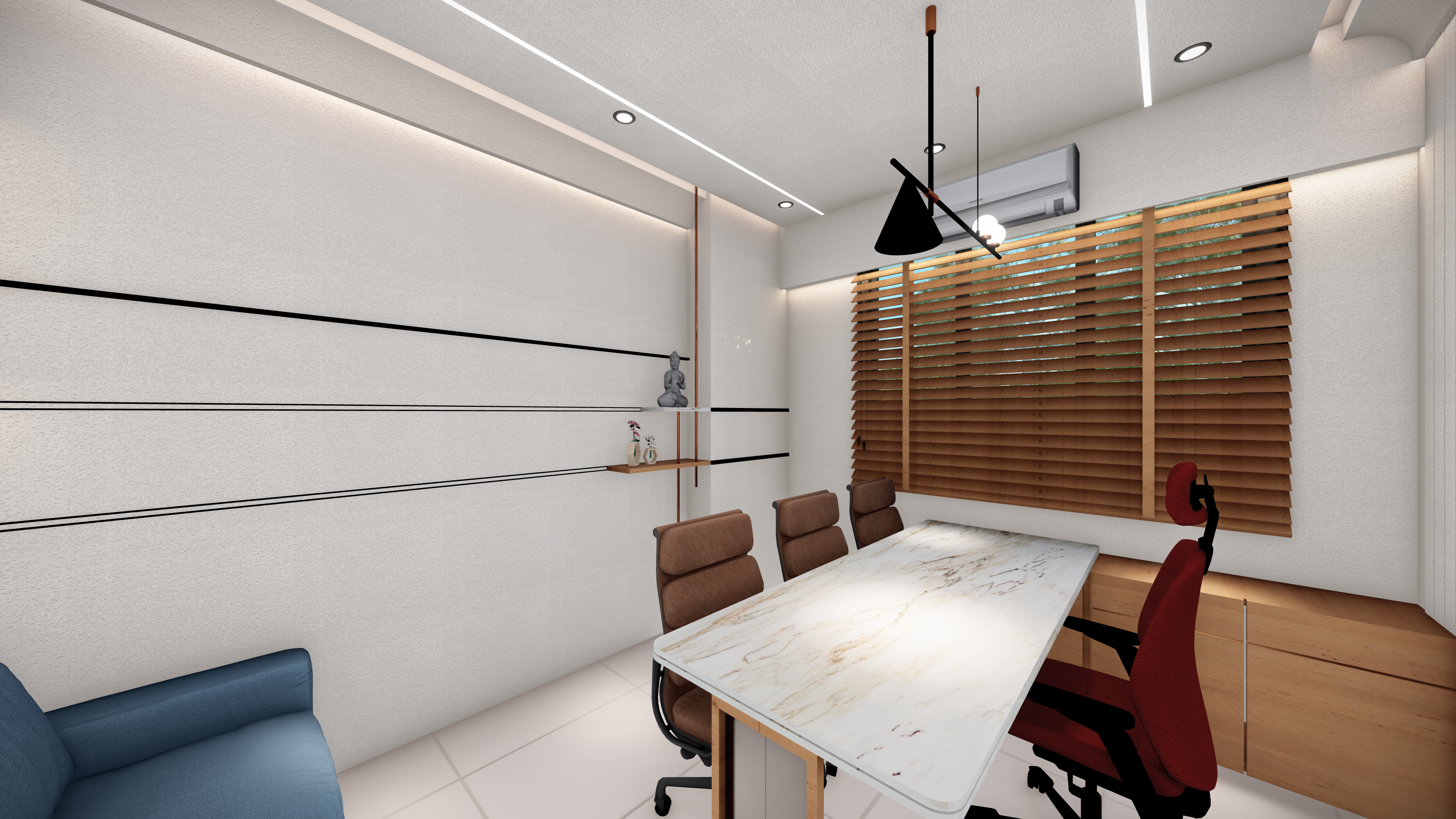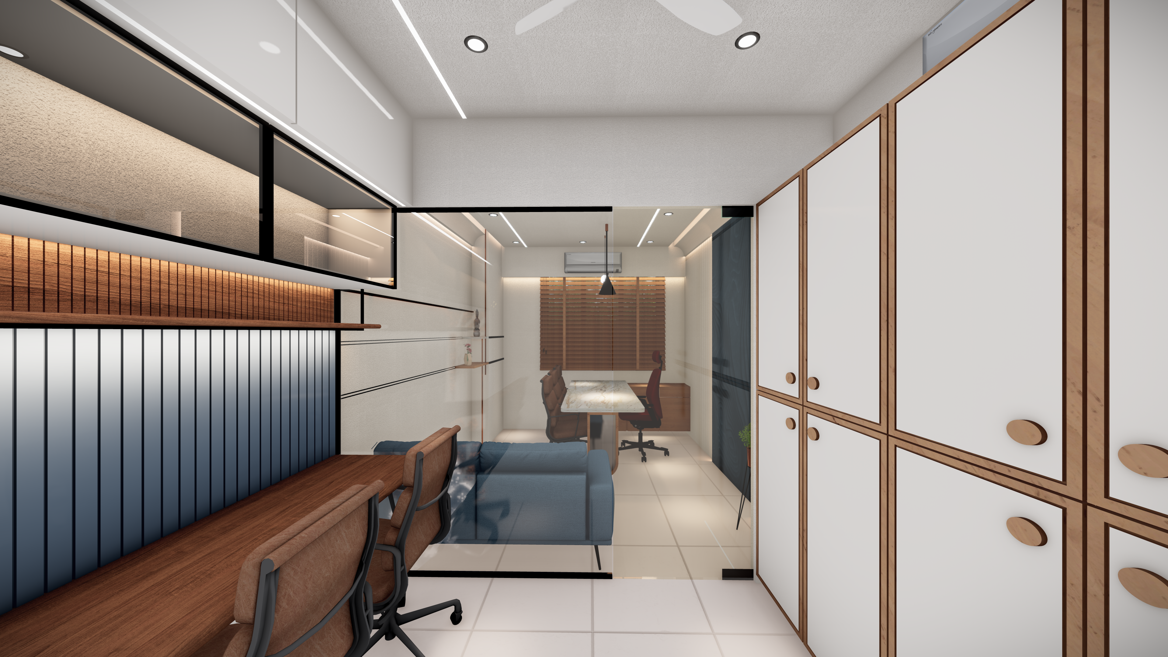 This office interior is designed with a simple and subtle approach, featuring clean lines, neutral tones, and minimal décor — perfectly tailored to meet the client’s preference for a calm, functional, and understated workspace.