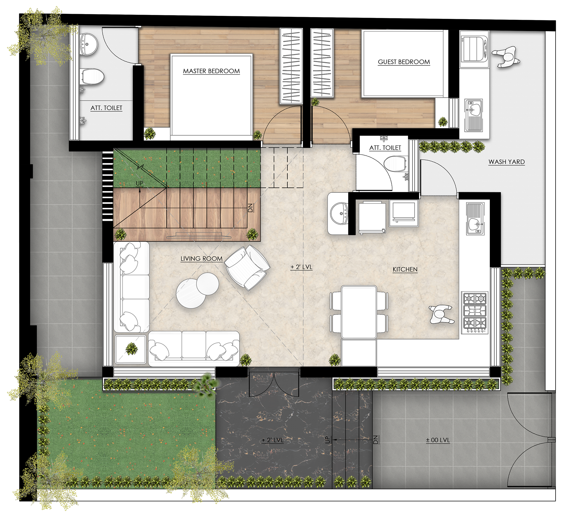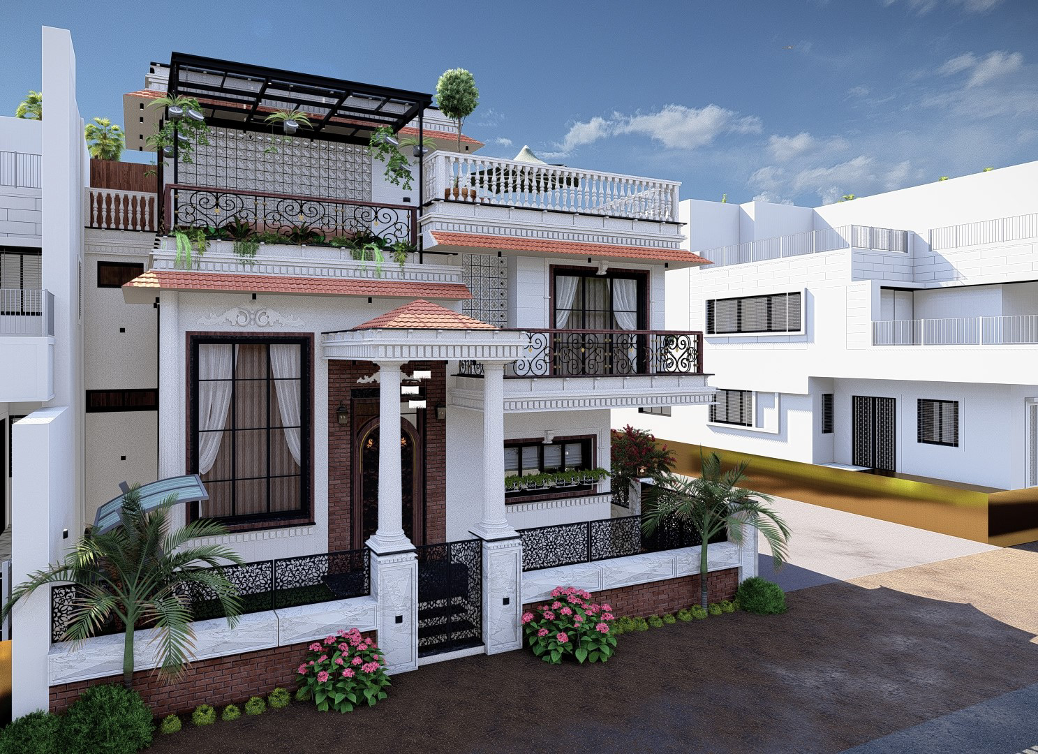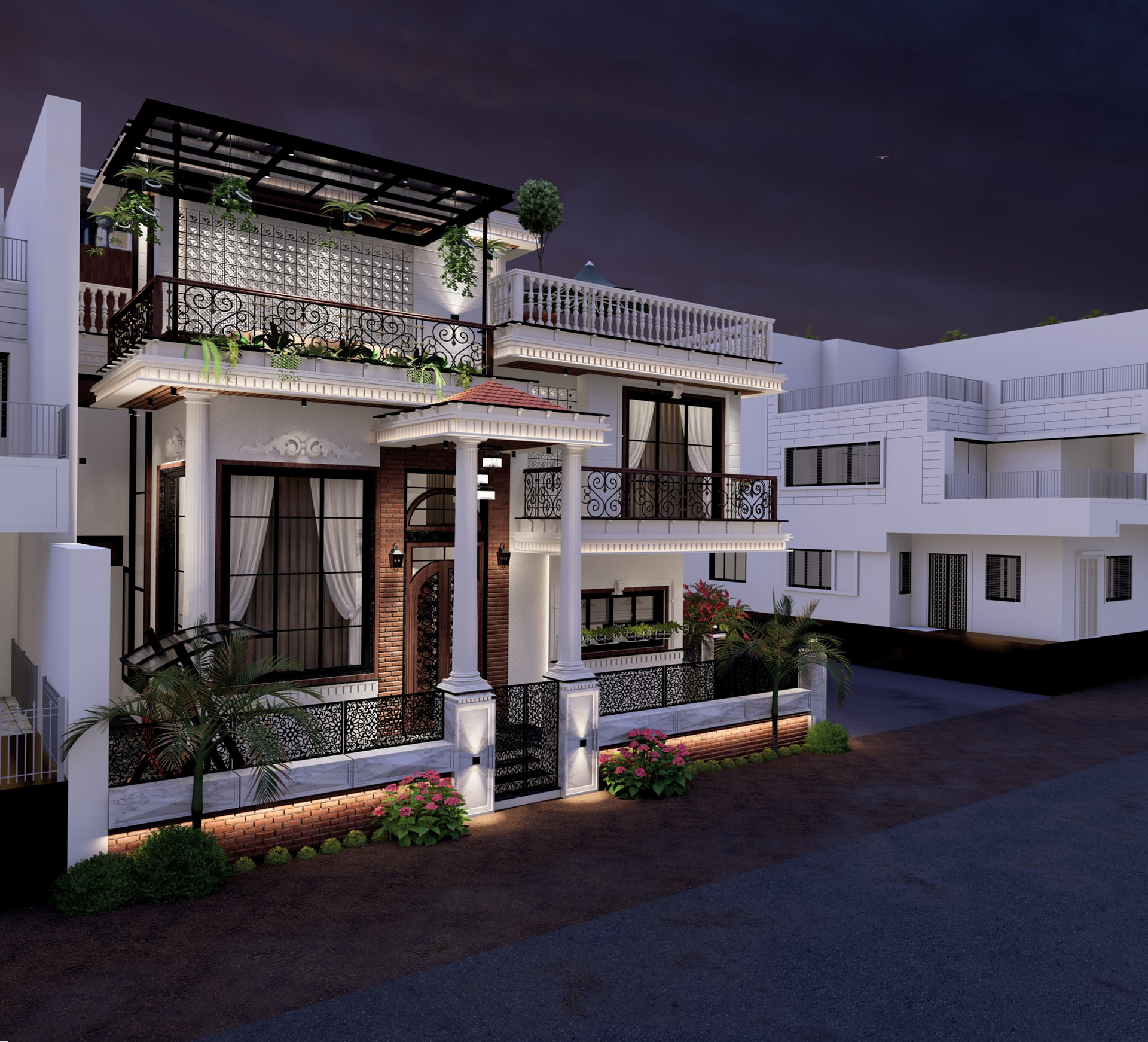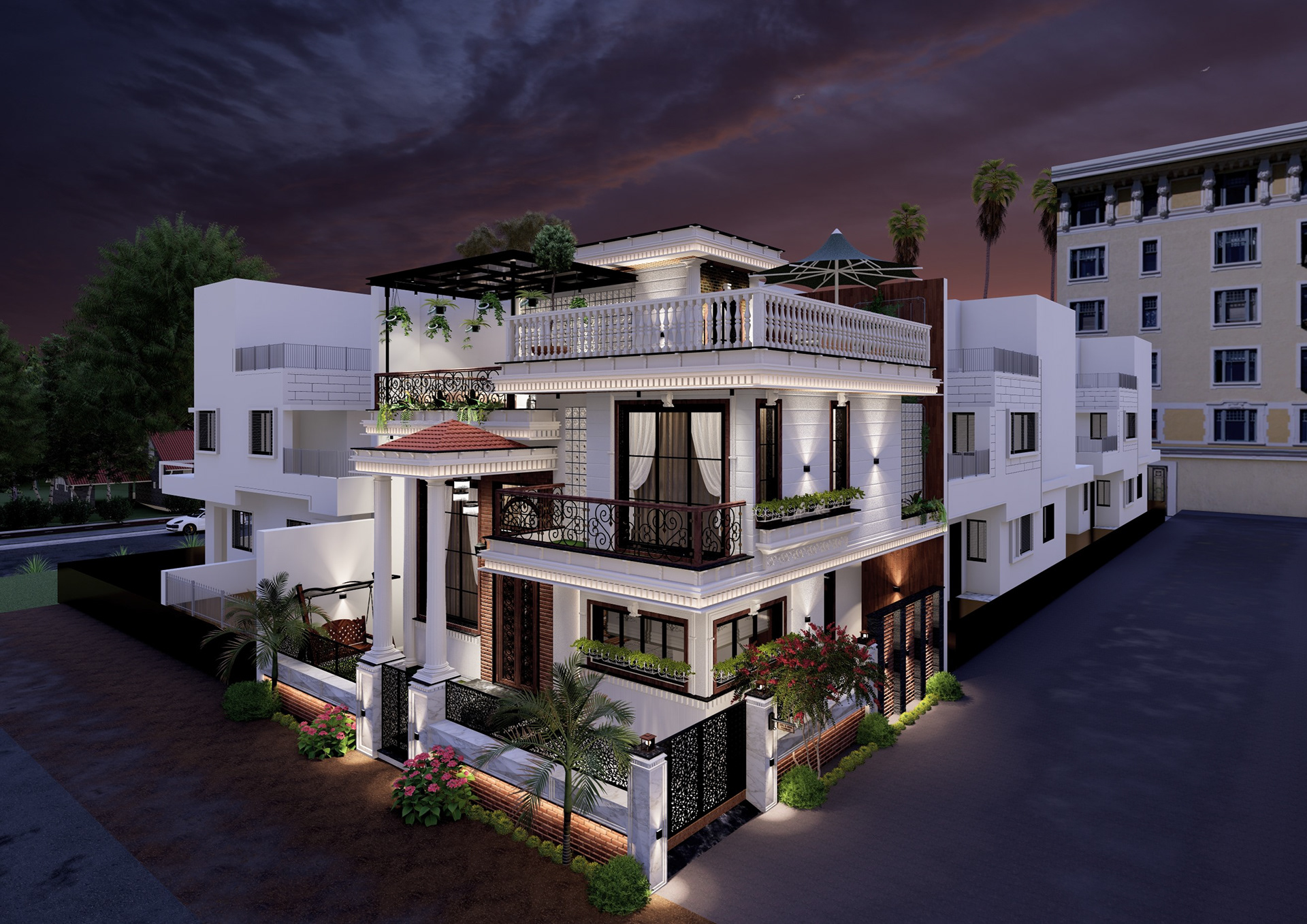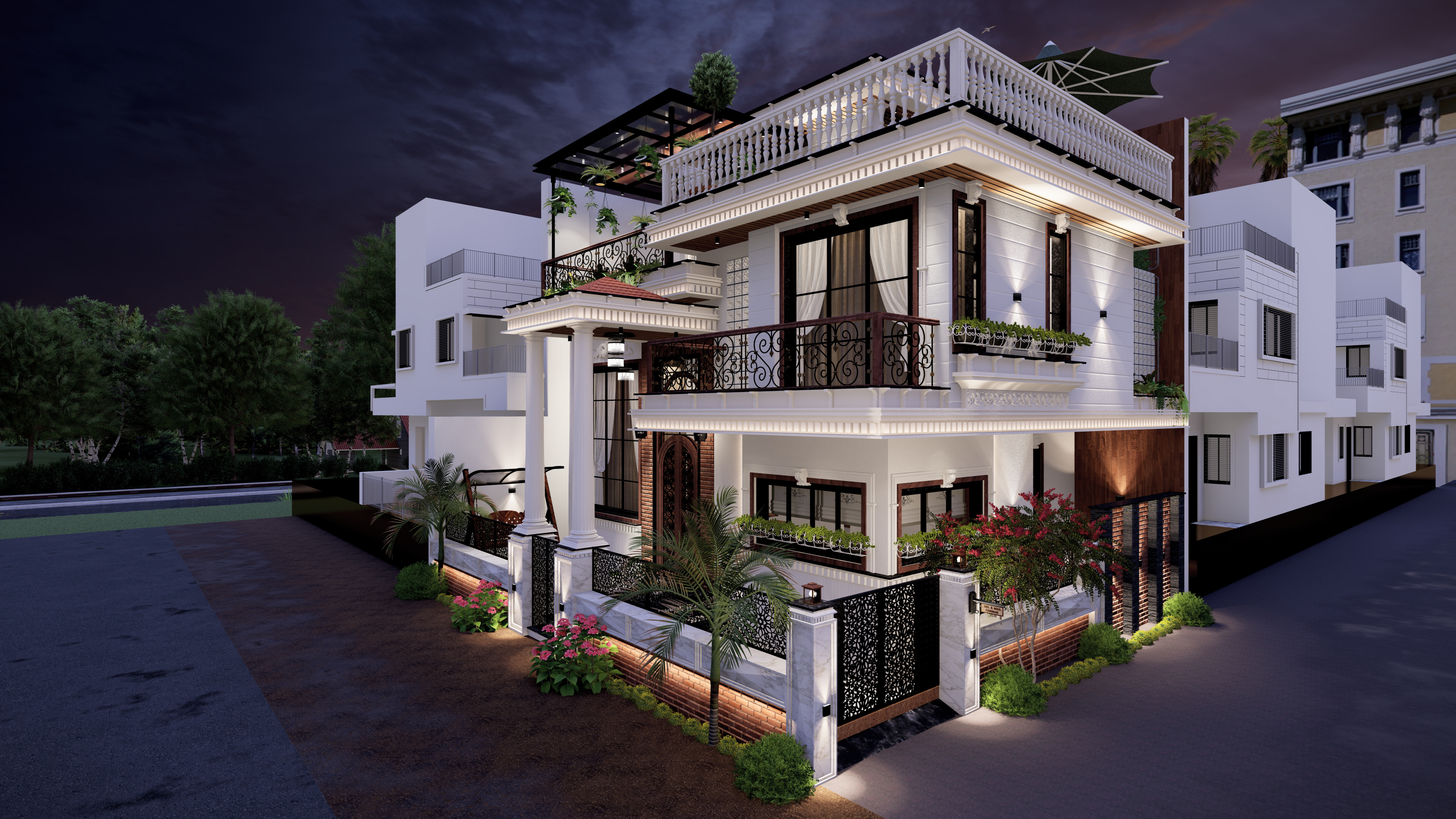 This weekend villa is designed with a grand and elegant style, featuring tall pillars, stylish balconies, and beautiful lighting that give it a look similar to a mini White House. With its unique charm and standout design, it has now become a landmark of the surrounding area, admired by everyone who passes by.