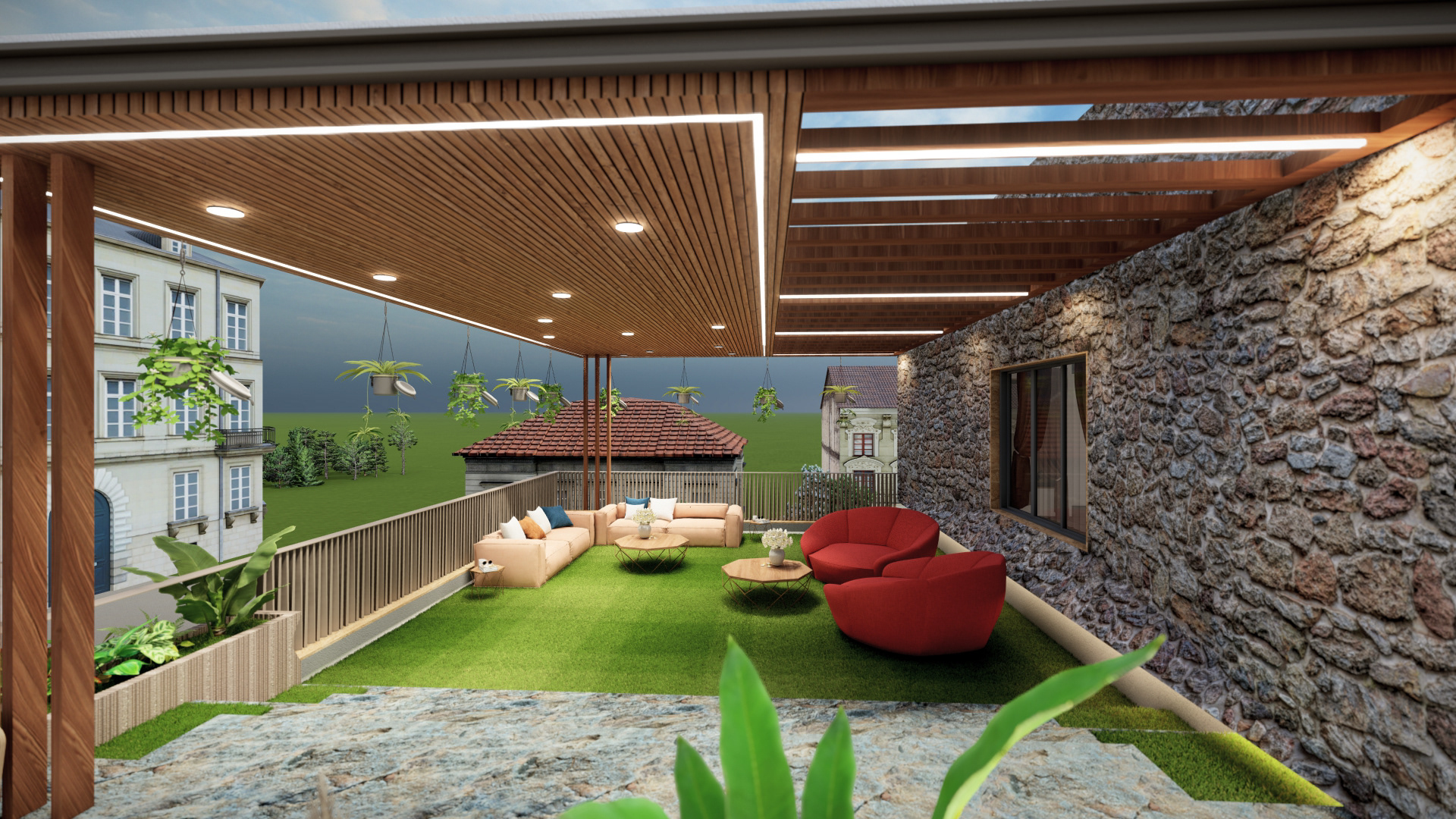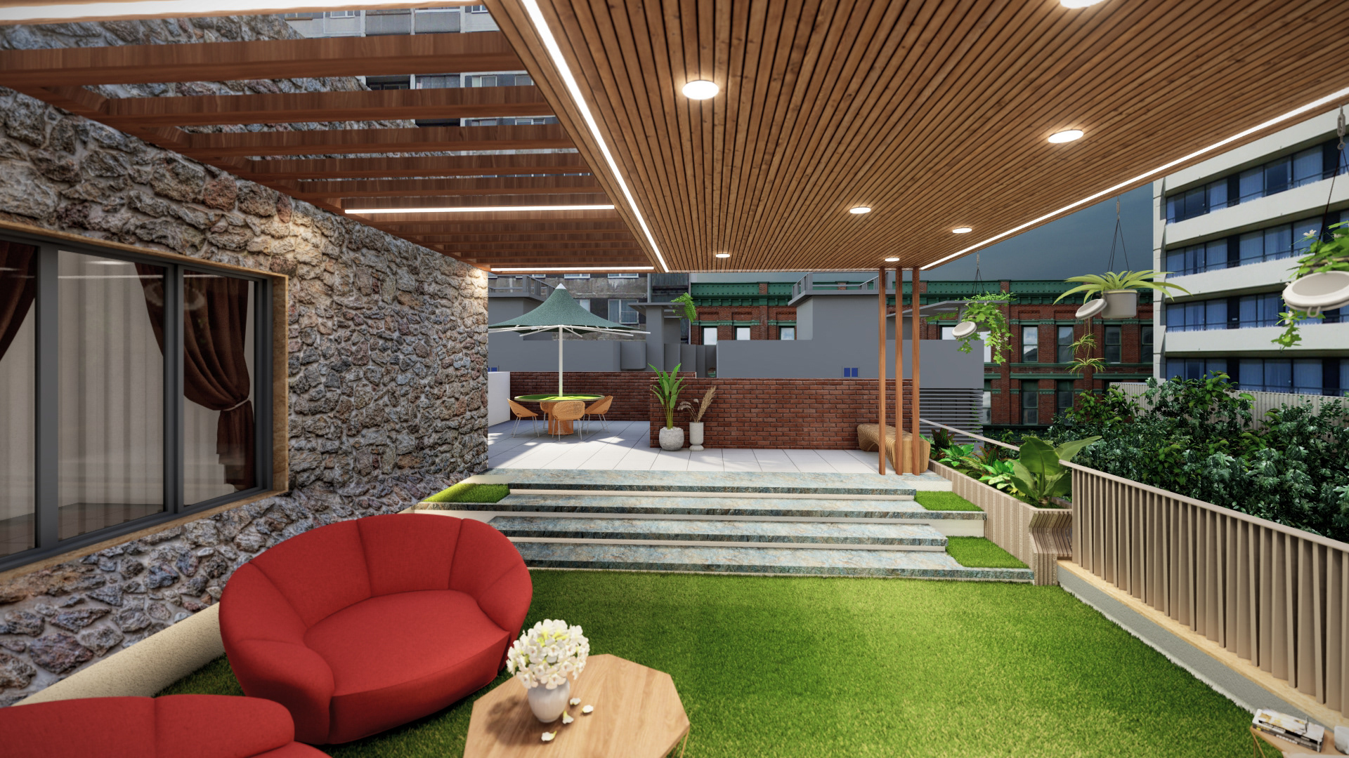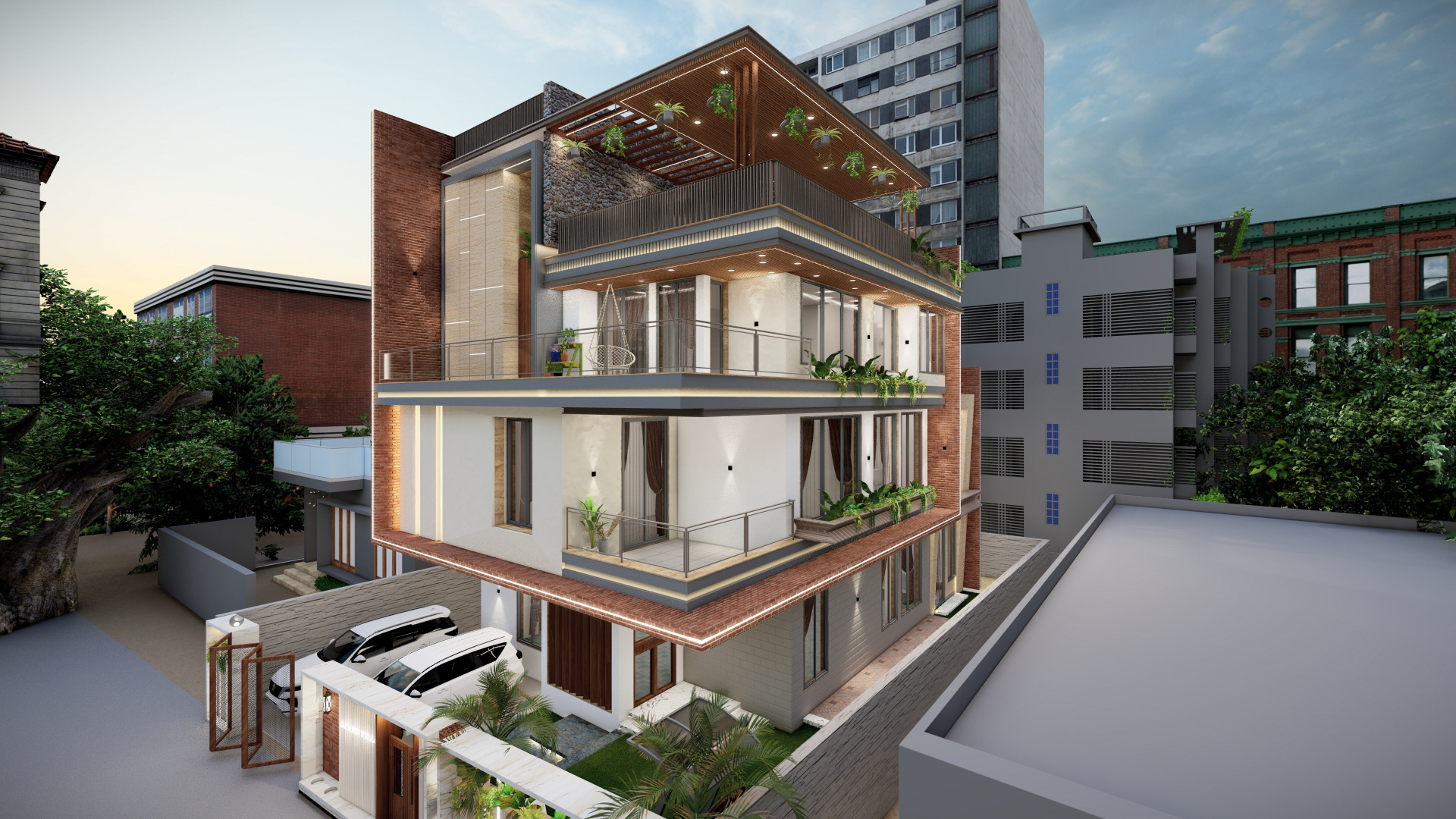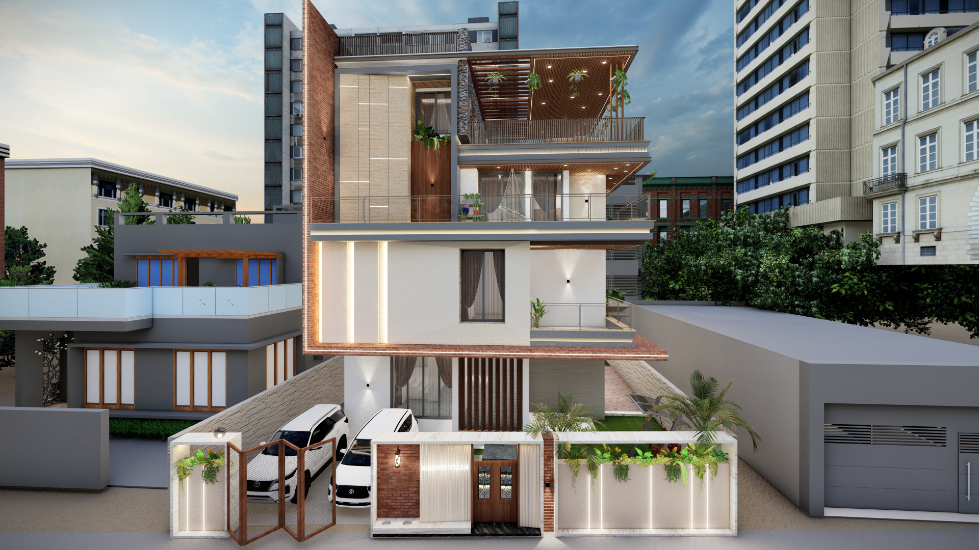 This residential bungalow showcases a contemporary architectural elevation complemented by thoughtfully designed terrace landscape, where clean lines, balanced proportions, and warm material palettes create a refined visual identity, while the outdoor sitting area enhance comfort, privacy, and a seamless connection between built form and open areas.