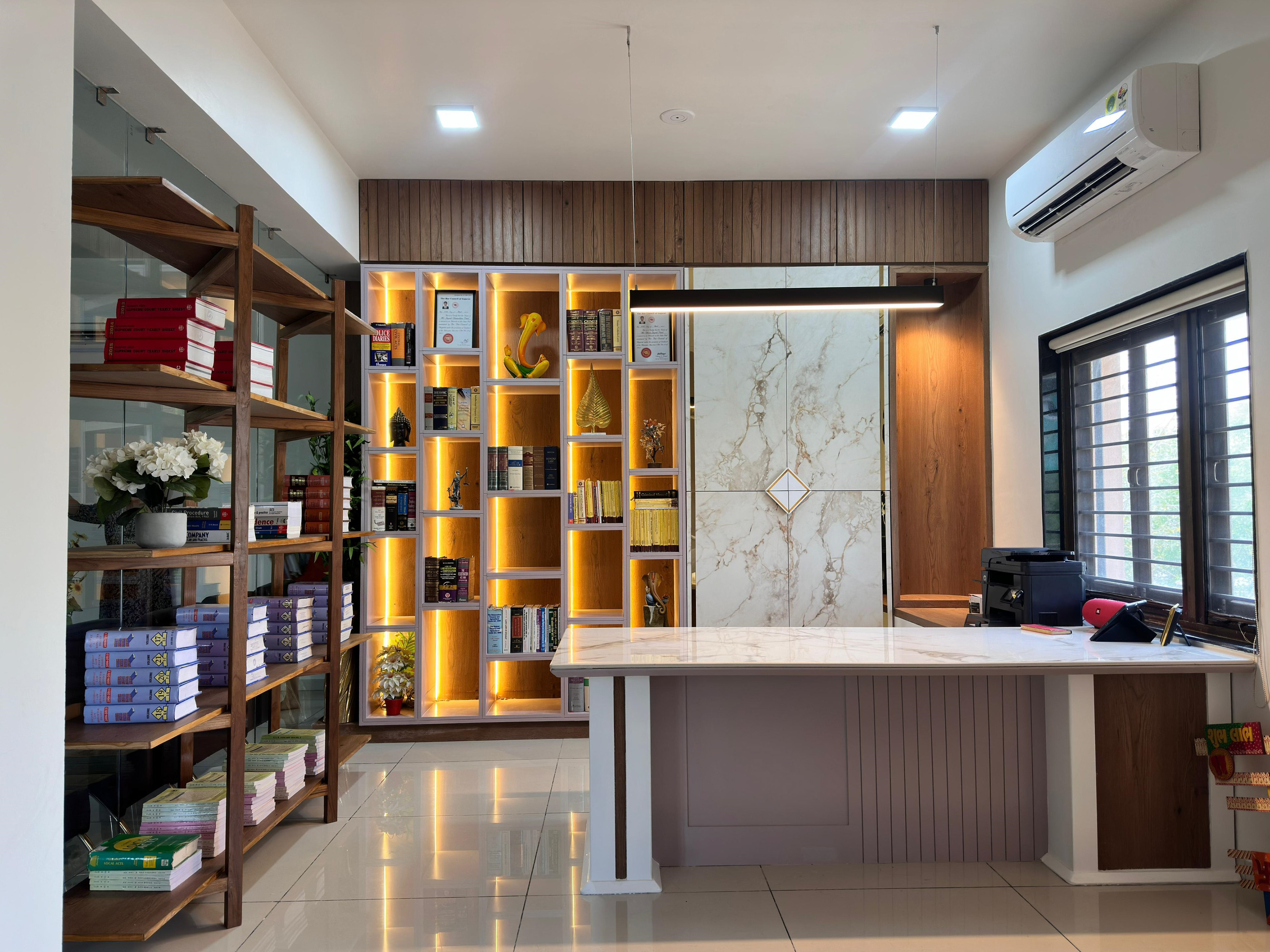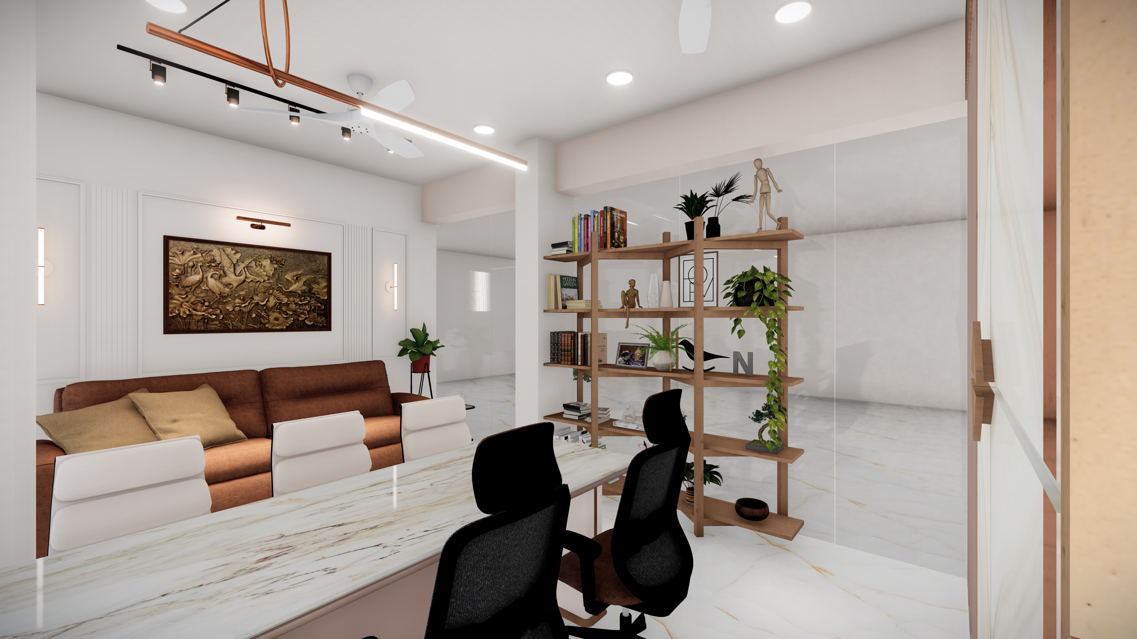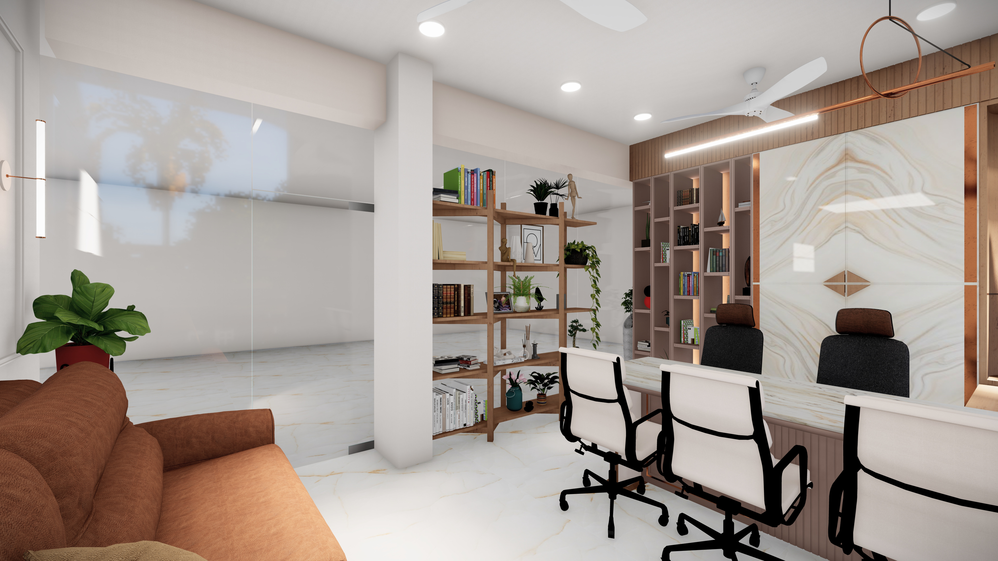 This home office is designed with a clean, organized, and professional appeal while still feeling warm and welcoming. The open wooden shelving with books and plants brings character and freshness, while the marble-finish backdrop with accent lighting adds sophistication. Neutral tones, ergonomic chairs, and ample natural light from the side window ensure comfort and focus.