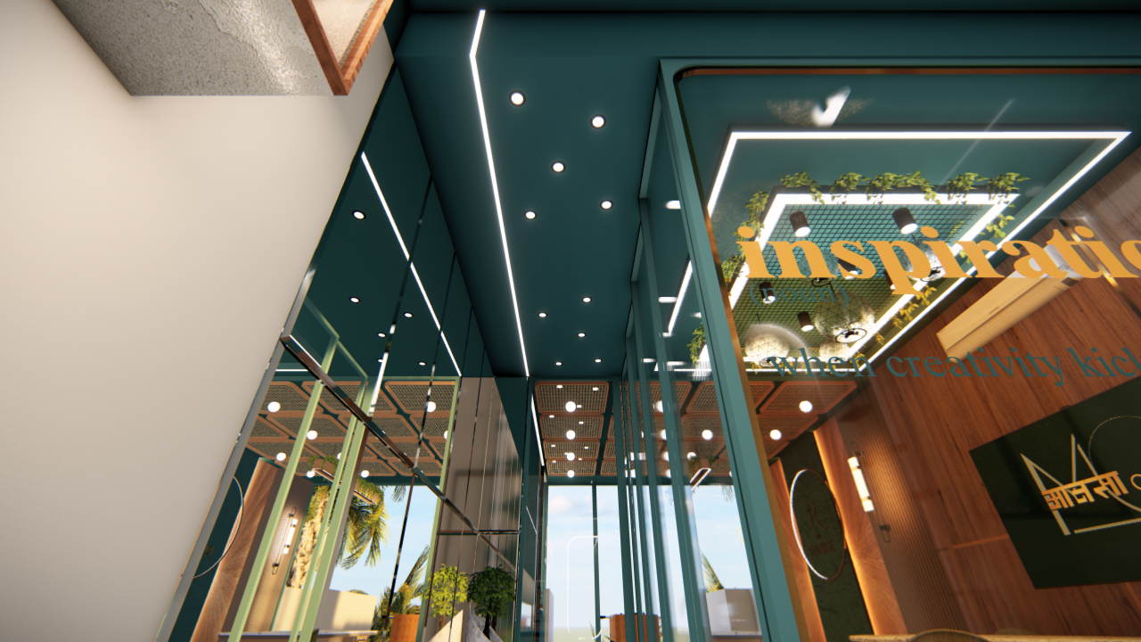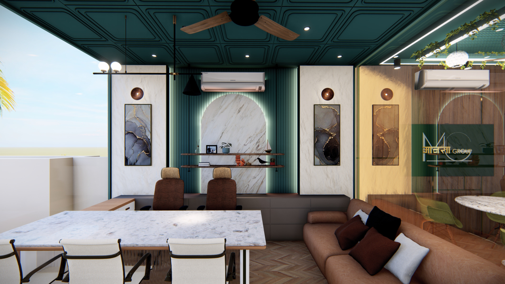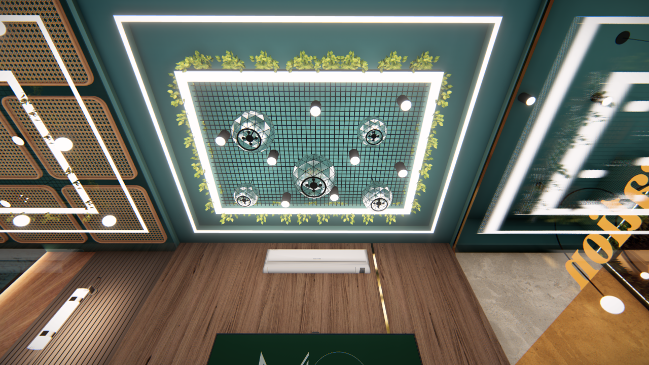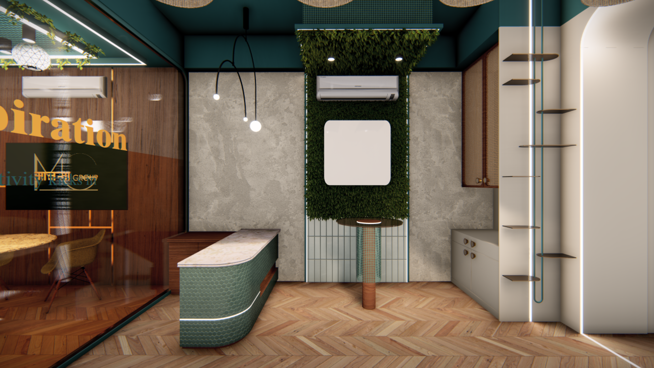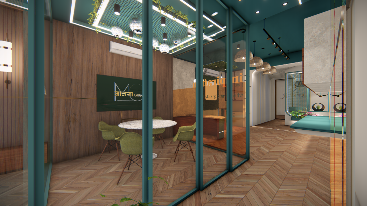 This office interior is designed to bring a balance of modern style and natural comfort. The wooden flooring and green wall features add warmth and freshness, while the glass partitions and bold ceiling lights make the space feel open and contemporary. Soft seating areas and creative design elements are placed thoughtfully to inspire collaboration, productivity, and relaxation. The overall atmosphere is lively yet professional, making it a perfect place where creativity and focus can come together.