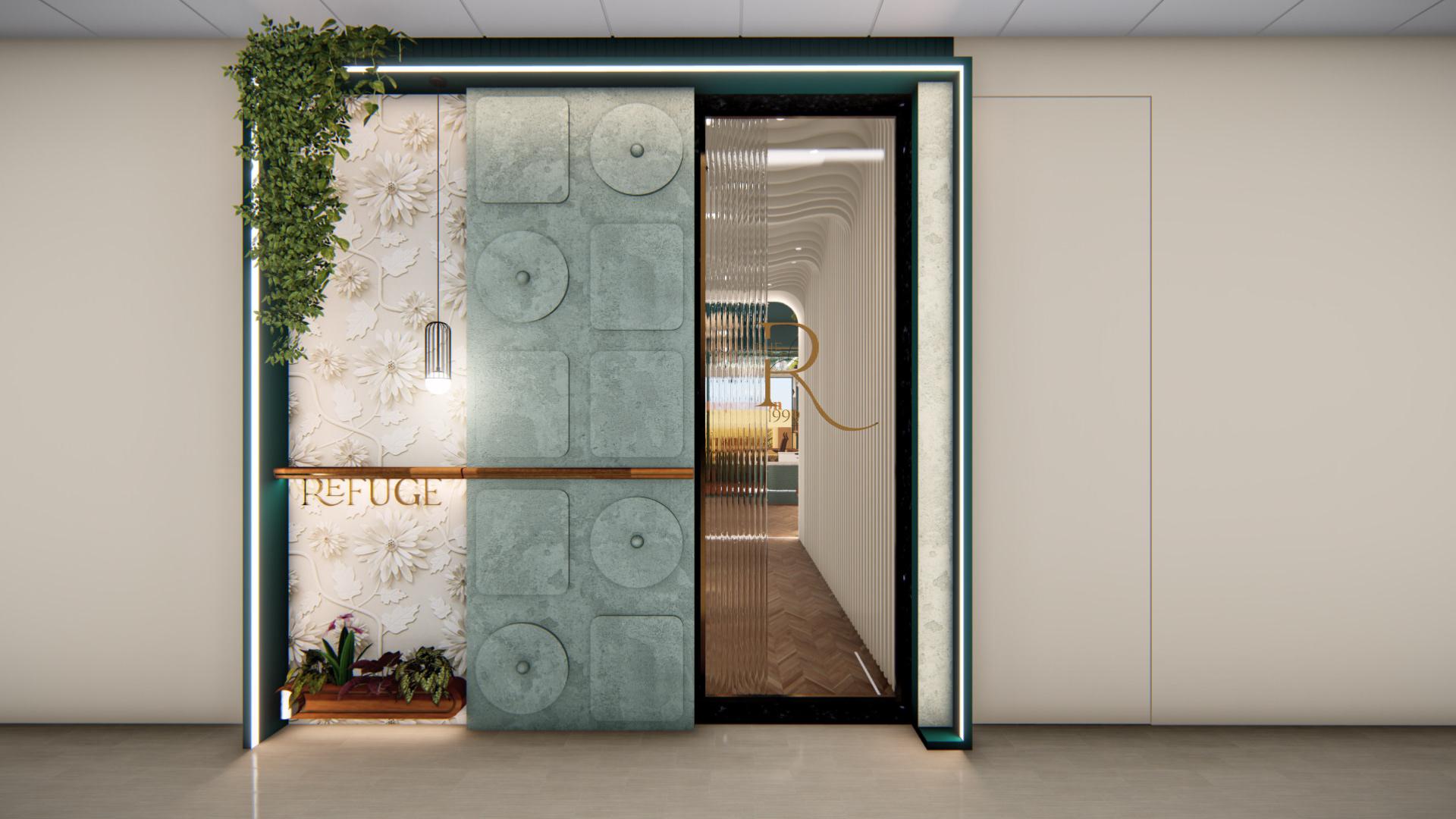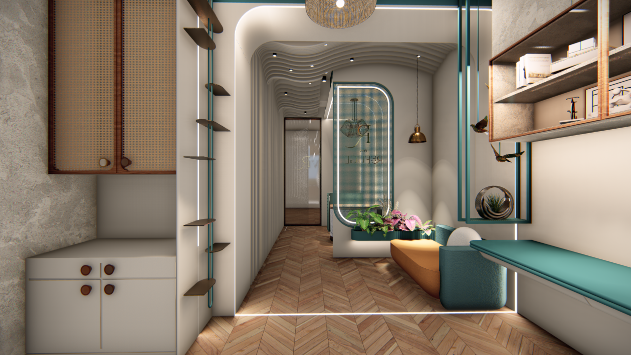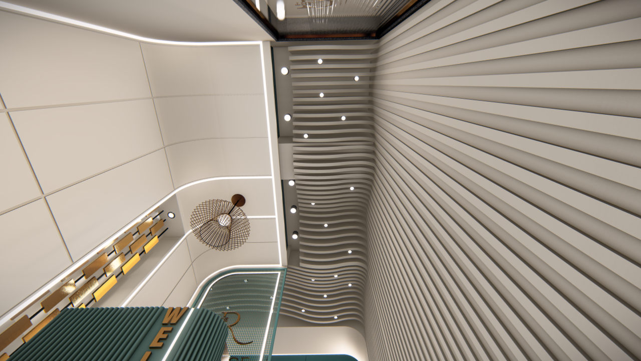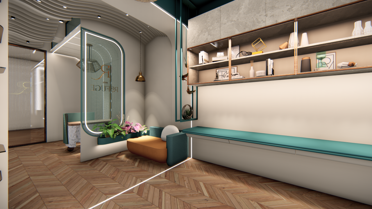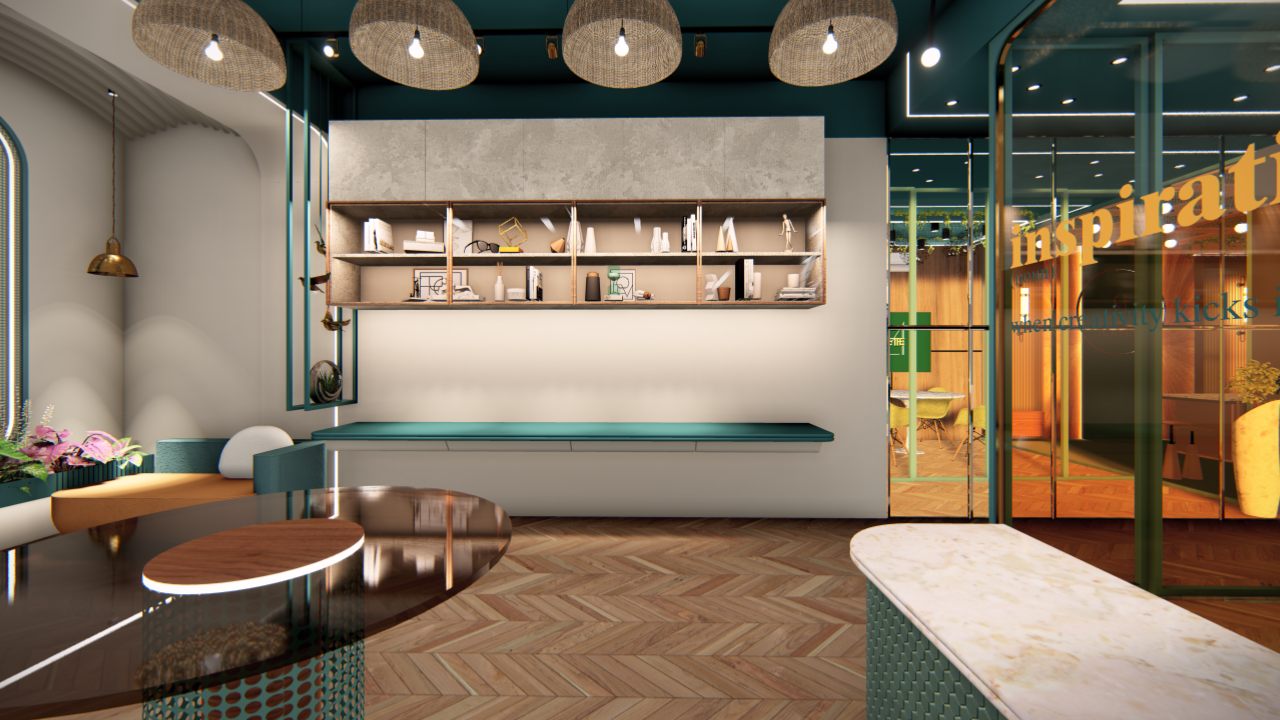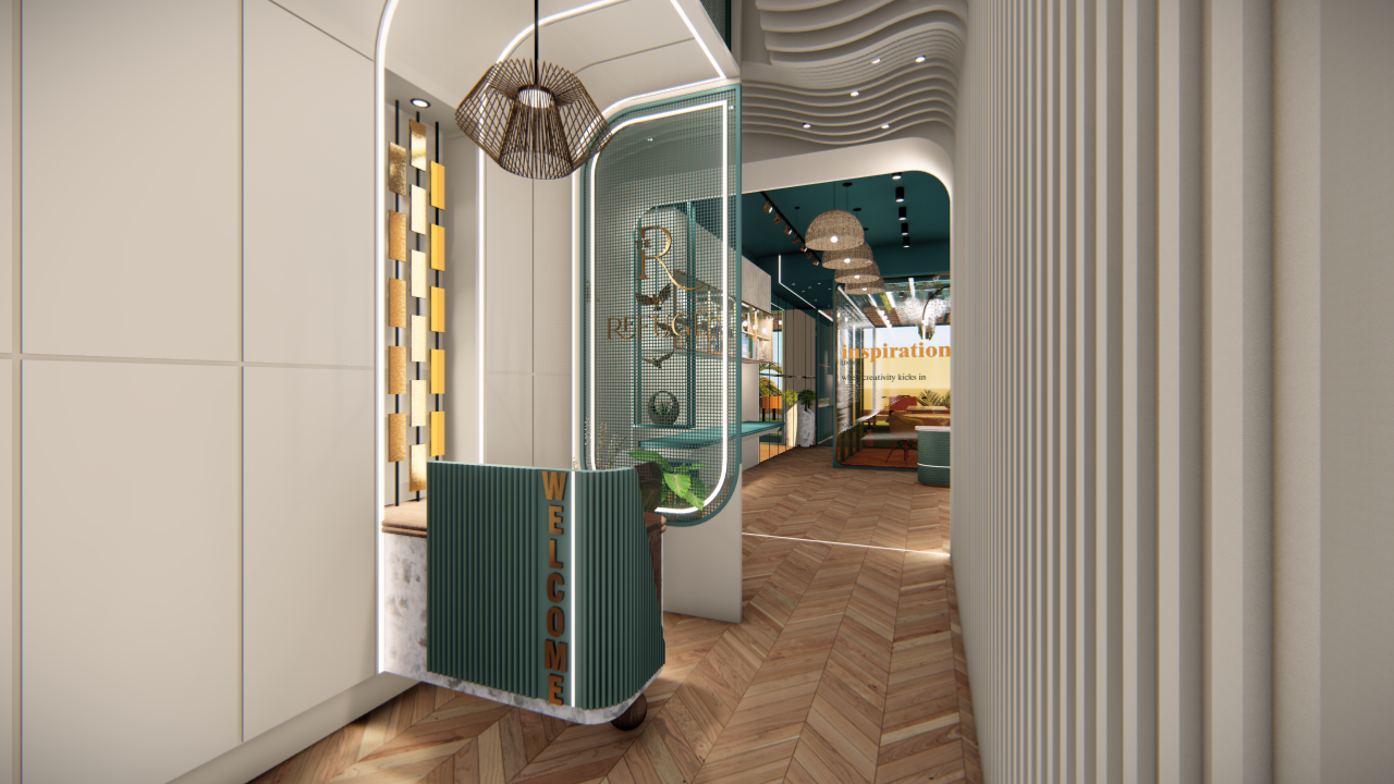 This office interior is designed to bring a balance of modern style and natural comfort. The wooden flooring and green wall features add warmth and freshness, while the glass partitions and bold ceiling lights make the space feel open and contemporary. Soft seating areas and creative design elements are placed thoughtfully to inspire collaboration, productivity, and relaxation. The overall atmosphere is lively yet professional, making it a perfect place where creativity and focus can come together.
