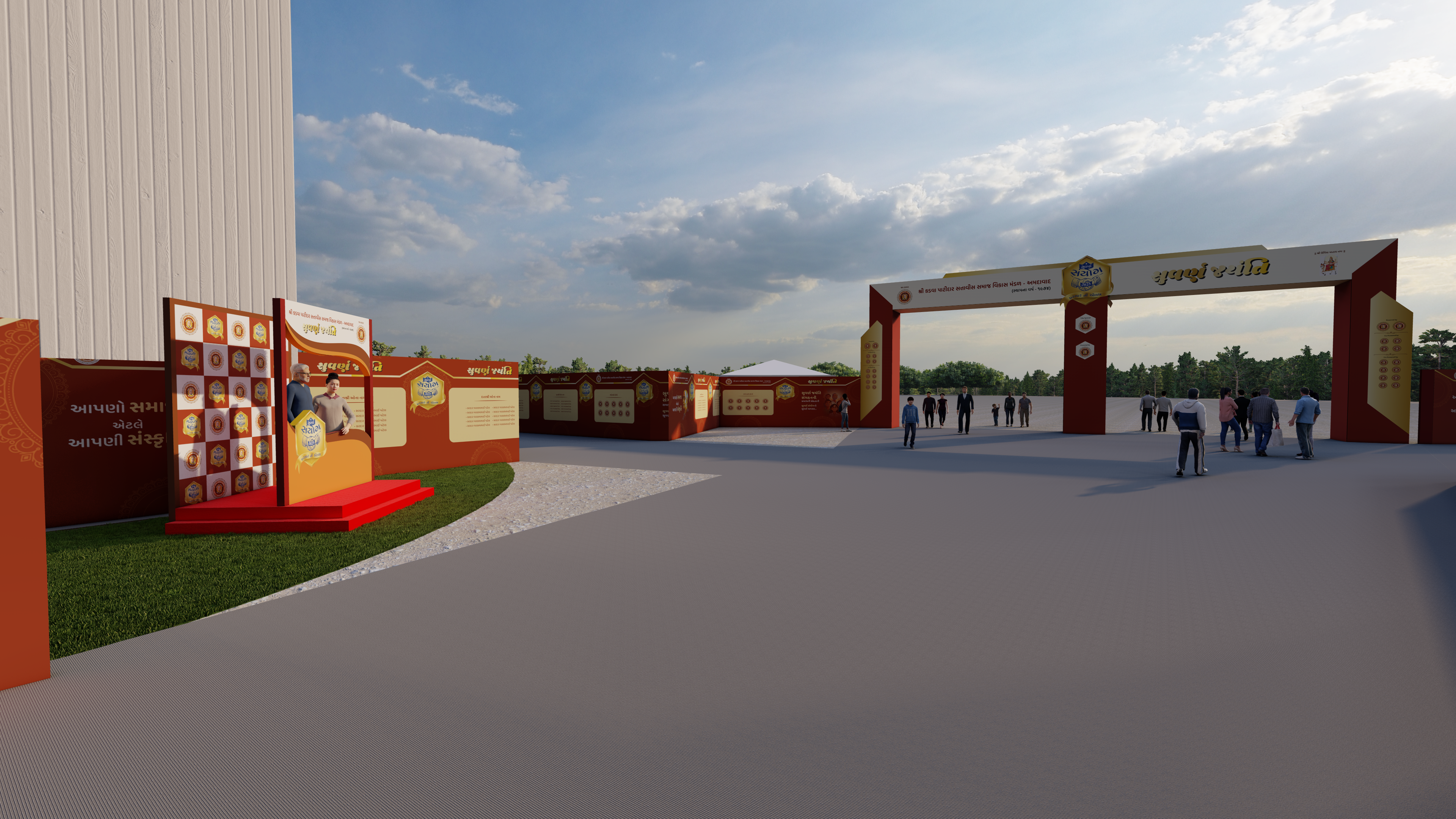 This design utilizes a bold red and gold palette to create a monumental entrance and a cohesive, branded environment for a cultural celebration. The layout integrates functional registration zones with immersive exhibition walls that guide visitors through a curated narrative. Interactive elements like dedicated photo stages are strategically placed to enhance guest engagement within a professional, large-scale event framework.